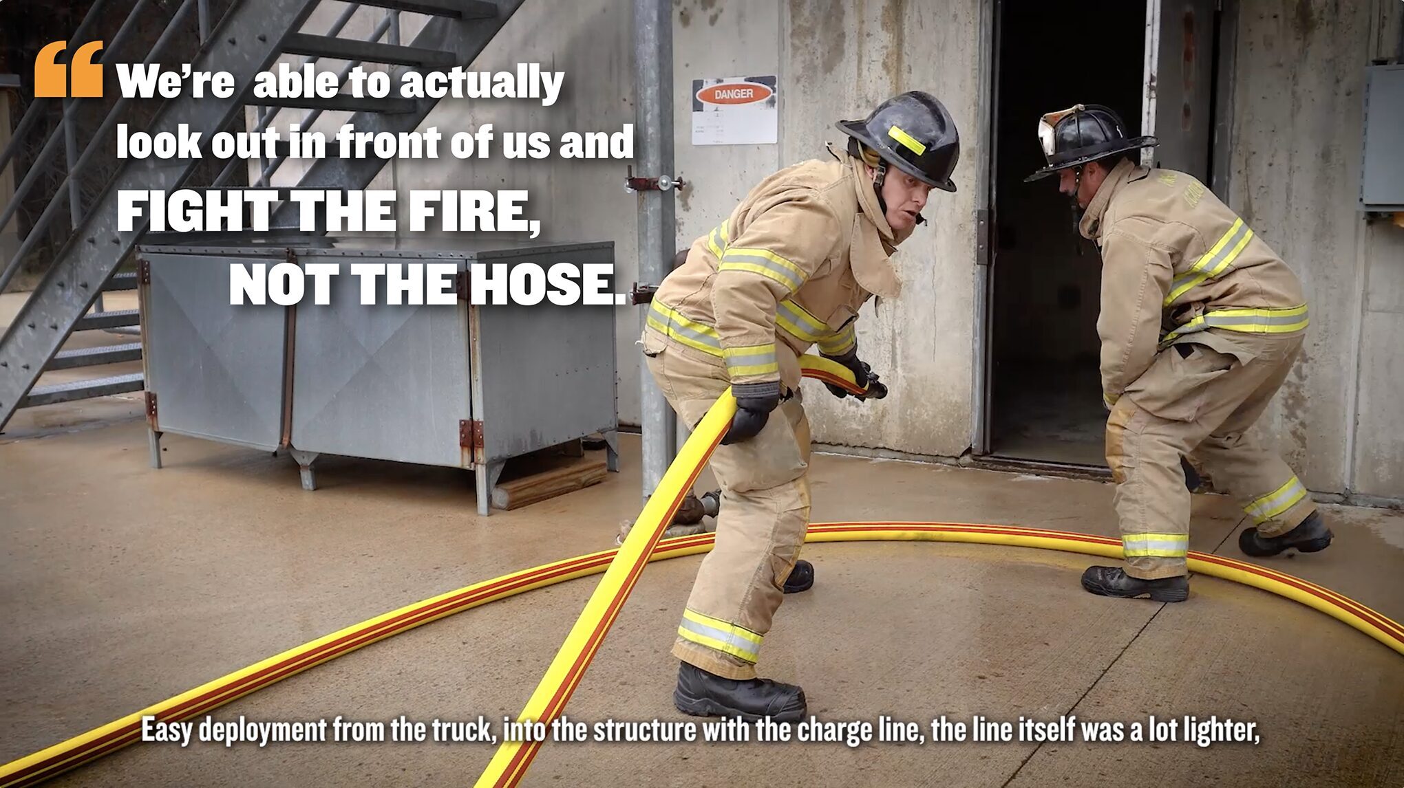 His crews had experimented with over-pumping a standard 2" hose to get higher flows, but found the hose to be unmanageable and the friction loss too high. "In order to achieve the GPM we wanted – a lot of water – with a manageable line for a single firefighter," they needed an alternative to both the 2" and the 2.5" hose.